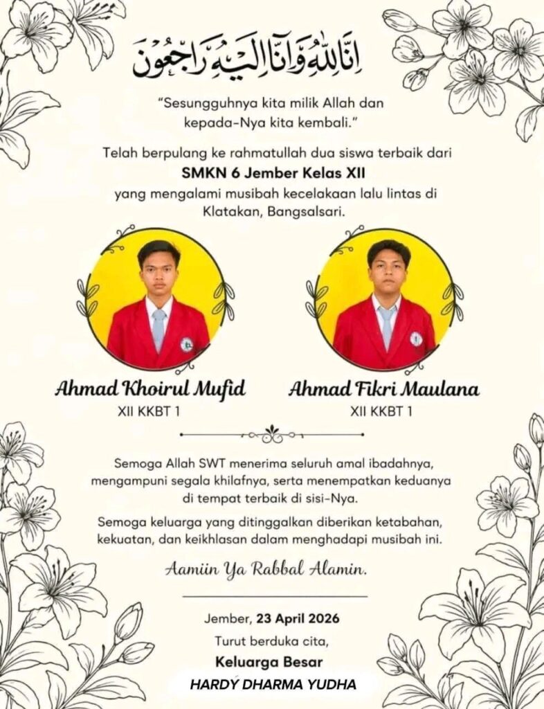 Kecelakaan lalu lintas tragis terjadi di jalur utama Jember-Lumajang, tepatnya di Desa Klatakan, Kecamatan Tanggul, Kabupaten Jember, Jawa Timur, Kamis (23/4/2026) sore. Insiden beruntun yang melibatkan sepeda motor, mobil, dan truk gandeng ini mengakibatkan dua pelajar sekolah menengah kejuruan (SMK) meninggal dunia di lokasi kejadian.